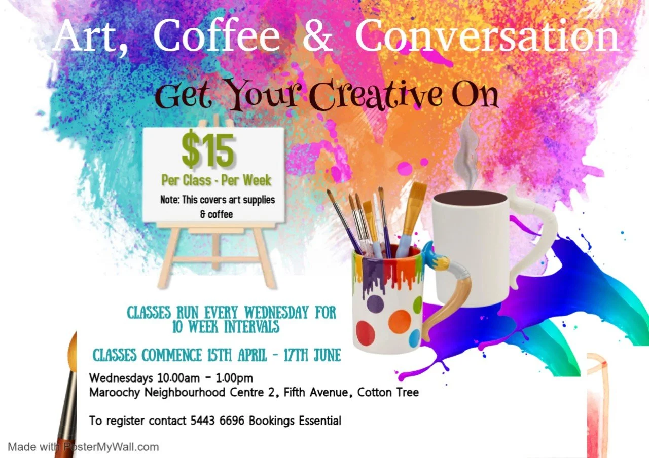 If you’re looking for a relaxed and inspiring space to explore your creativity, join us at the Maroochy Neighbourhood Centre for Art, Coffee & Conversation.